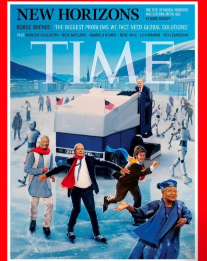 La edición en al que aparece el Presidente se titula New Horizons (Nuevos Horizontes), y se basa en el Foro de Davos de este año. El dibujo muestra a Trump a bordo de una máquina para aplanar el hielo sobre una pista de patinaje en la que están el resto de los personajes.