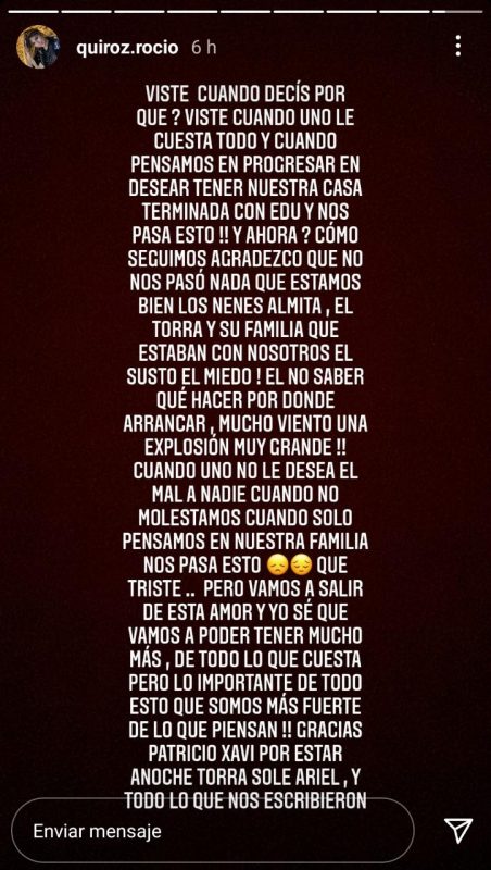 Ayer la cumbiera fue victima del terrible temporal: se destrozó la casa que se estaba construyendo en Chascomús. Rocío compartió la bronca y la angustia junto con sus seguidores. “¿Viste cuando decís por qué? ¿Viste cuando a uno le cuesta todo y cuando pensamos en progresar, en desear tener nuestra casa terminada con Edu y nos pasa esto? ¡¿Y ahora?! ¿Cómo seguimos? Agradezco que no nos pasó nada, que estamos bien los nenes, almita, el torra y su familia que estaban con nosotros. El susto, el miedo, el no saber qué hacer, por dónde arrancar, mucho viento, una explosión muy grande!!“, escribió la cantante.