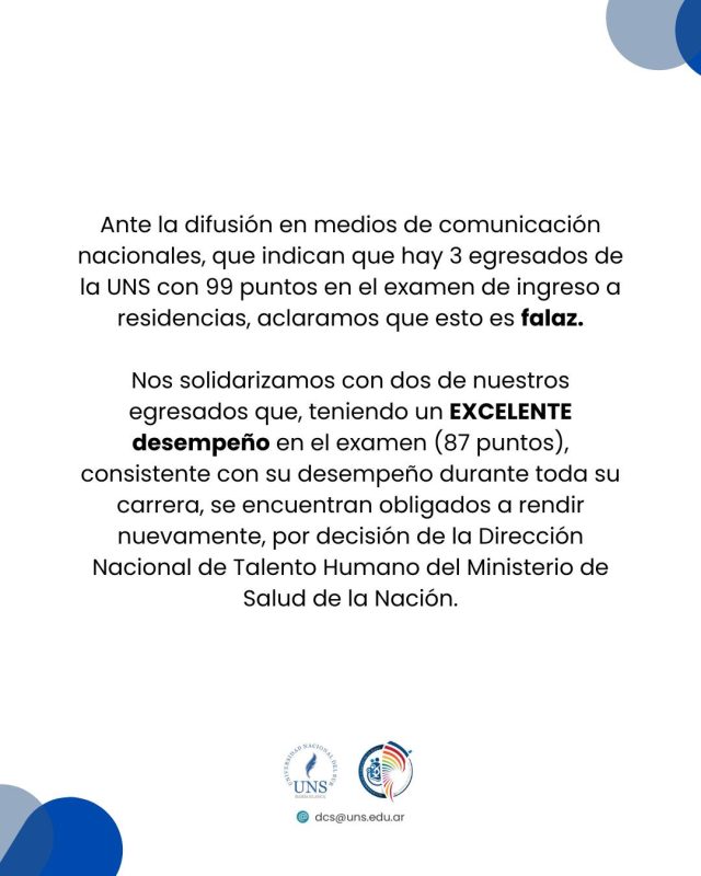 El Departamento de Ciencias de la Salud de la Universidad del Sur señaló que es “falaz” la información difundida por los medios de comunicación nacionales que indica que hay tres egresados de esa casa de altos estudios con 99 puntos en el examen de ingreso a residencias.