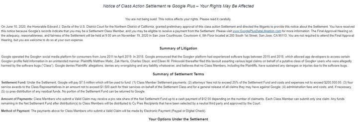 “No estás siendo demandado. Esta notificación afecta tus derechos. Por favor, leela atentamente”, dice el correo enviado por google-noreply@google.com. Además, generó más dudas si el mail era legítimo por su diseño y por redirigir a los receptores a la web www.googleplusdatalitigation.com.