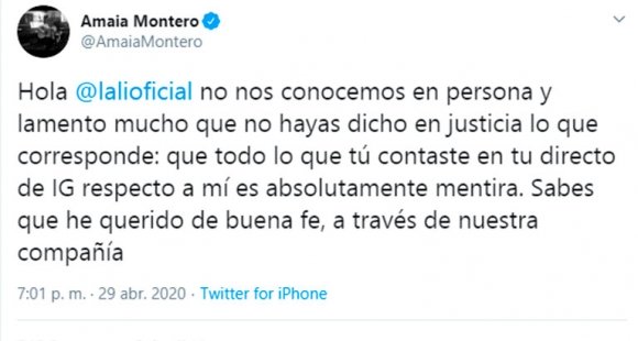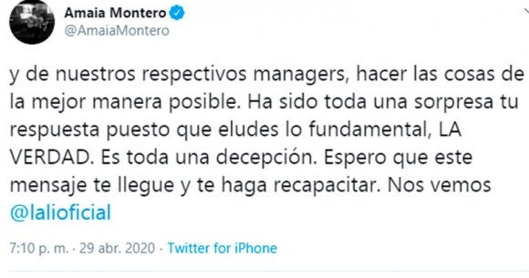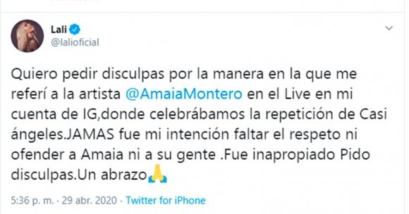 La anécdota sobre la que ningún medio había reparado llegó a oídos de Amaia, quien se quejó con las autoridades de su compañía discográfica y Lali debió disculparse en Twitter: “Quiero pedir disculpas por la manera en la que me referí a la artista @AmaiaMontero en el Live en mi cuenta de IG, donde celebrábamos la repetición de Casi Ángeles. Jamás fue mi intención faltar el respeto ni ofender a Amaia ni a su gente. Fue inapropiado. Pido disculpas. Un abrazo”.