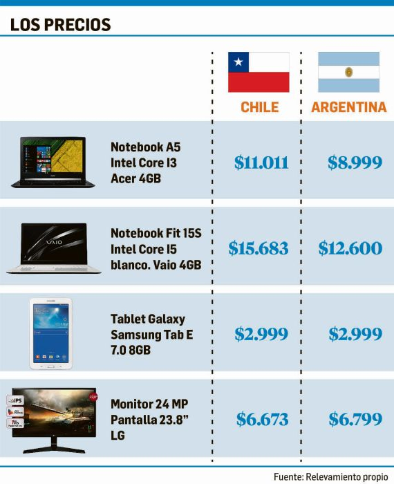 Así, por ejemplo, una notebook marca Acer modelo Inter Core I3 con una memoria de 4 GB en Chile se consigue a $11.011 (tomando el cambio de ayer). La misma en la Argentina tiene un precio de $8.999, es decir, un 22,35% menos, algo impensado un año atrás. Claro que la situación es muy distinta con otros productos tecnológicos como televisores, celulares y hasta electrodomésticos de línea blanca.
