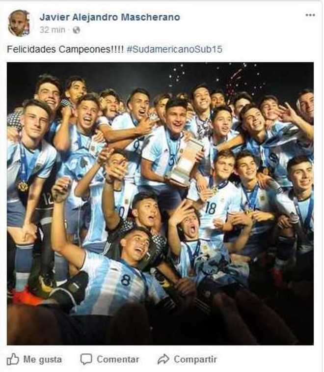 El título conseguido este domingo tras derrotar 3-2 a Brasil en un partidazo, lógicamente, generó la admiración y el respeto de toda la esfera futbolera. Y como para que no queden dudas de eso, algunas personalidades del mundo de la número cinco se expidieron al respecto en redes sociales. Por caso, dos de los hombres que forman parte de la Selección Mayor felicitaron y saludaron a los chicos del Sub 15 a través de sus respectivas cuentas de Facebook y Twitter.