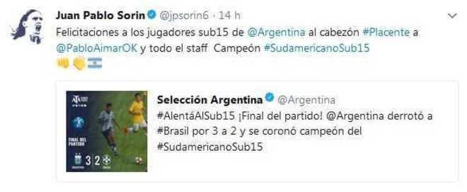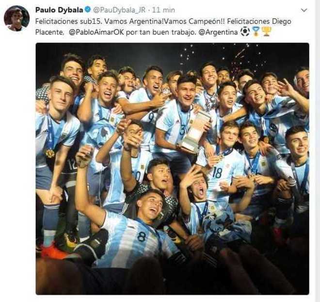 Sí: Javier Mascherano y Paulo Dybala fueron dos de los jugadores que les dedicaron unas palabras a los dirigidos por Diego Placente. Pero claro: no fueron los únicos. Leo Ponzio, volante de River, y Juan Pablo Sorín, ex capitán histórico de la Albiceleste hicieron lo propio al igual que las cuentas de los clubes en los que juegan los chicos campeones.
