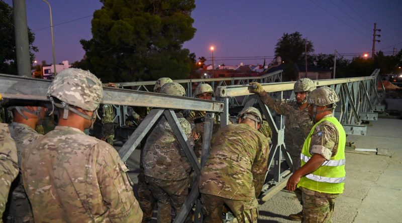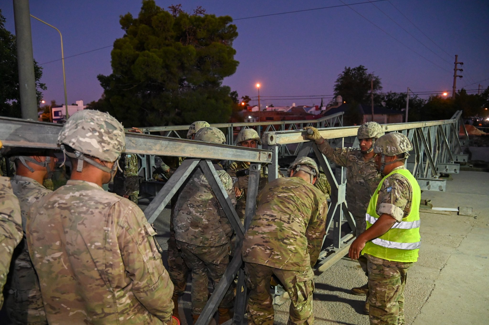 El Ejército Argentino está desplegando un puente táctico Mabey Compact sobre el canal Maldonado, entre Sixto Laspiur y Malvinas.
