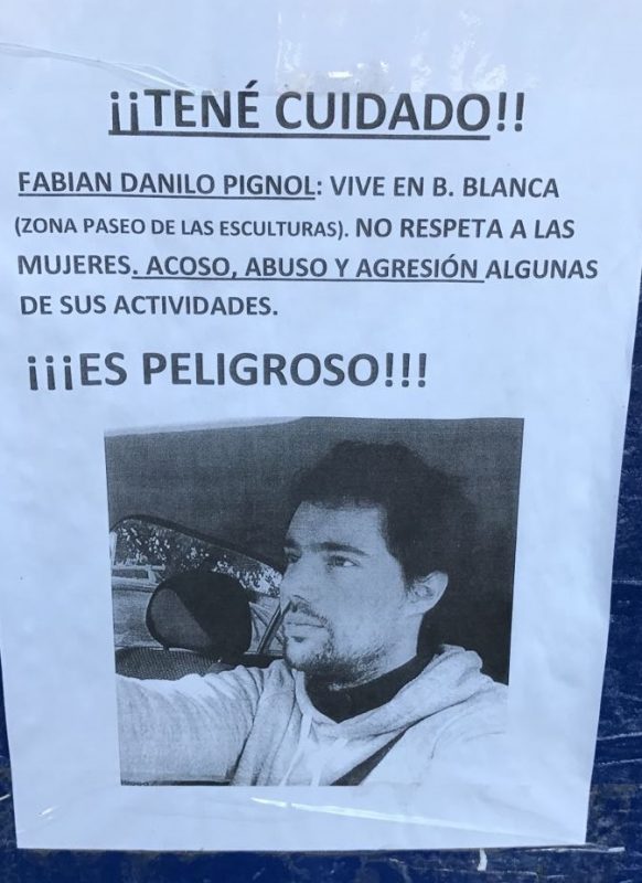 En la esquina de Lamadrid y Alsina, entre otras zonas del macro y micro centro de la ciudad, se puede ver esta anónima acusación a Fabián Danilo Pignol, bahiense que fue escrachado en las redes sociales por acoso virtual a distintas mujeres de Bahía Blanca.