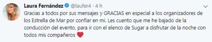 Más allá de estas polémicas, fue la propia Laurita quien, a través de las redes sociales, explicó los motivos de su decisión de no aceptar la propuesta para conducir los premios: “Gracias a todos por sus mensajes y GRACIAS en especial a los organizadores de los Estrella de Mar por confiar en mi. Les cuento que me he bajado de la conducción del evento, para ir con el elenco de Sugar a disfrutar de la noche con todos mis compañeros”.