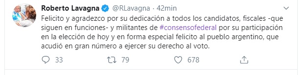 “Felicito y agradezco por su dedicación a todos los candidatos, fiscales -que siguen en funciones- y militantes de #consensofederal por su participación en la elección de hoy y en forma especial felicito al pueblo argentino, que acudió en gran número a ejercer su derecho al voto”.