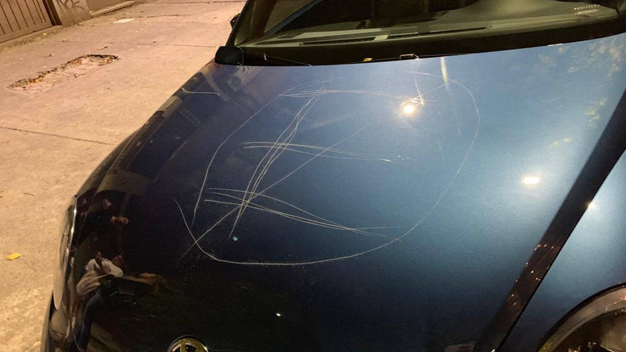 Un vecino se encontró con un auto estacionado en la entrada de su garaje y lo destrozó. Lo pateó, lo rayó y lo pintó antes de irse en su vehículo.