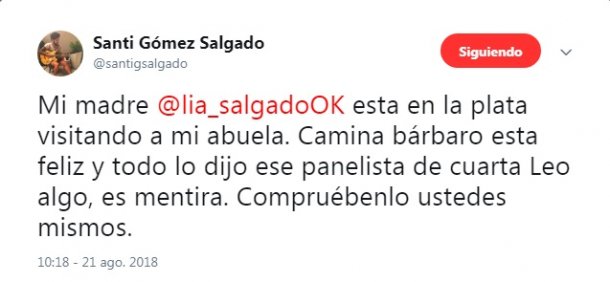 “Mi madre @lia_salgadoOK está en la plata visitando a mi abuela. Camina bárbaro, está feliz y todo lo dijo ese panelista de cuarta Leo algo, es mentira. Compruébenlo ustedes mismos”, lanzó Santiago en la misma red social, indignado por la falsa información que trascendió.