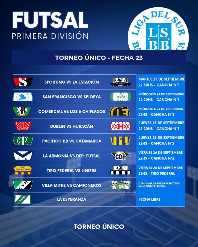 Esta semana se disputa la fecha 23 del Torneo Único de Futsal que organiza la Liga del Sur, con una programación que incluye tanto los partidos de la categoría principal como los encuentros de reserva, que se juegan como preliminares.