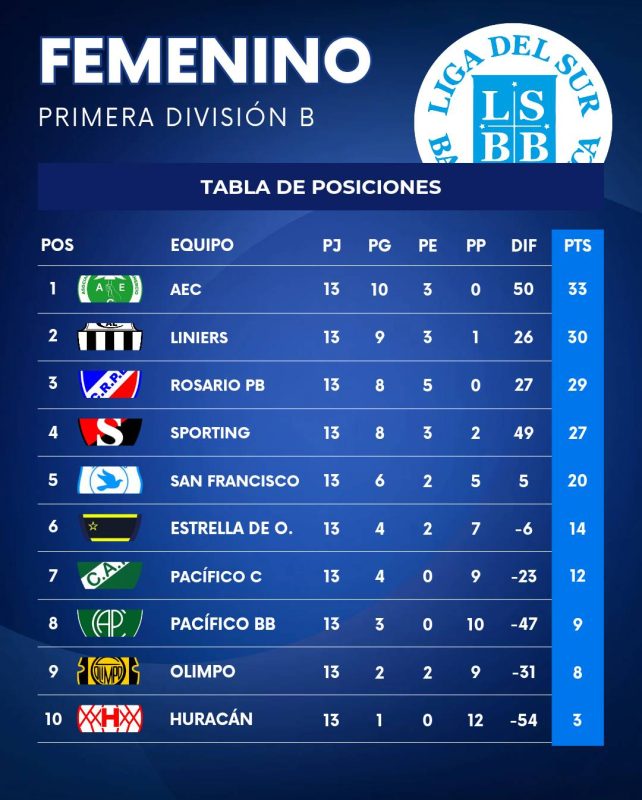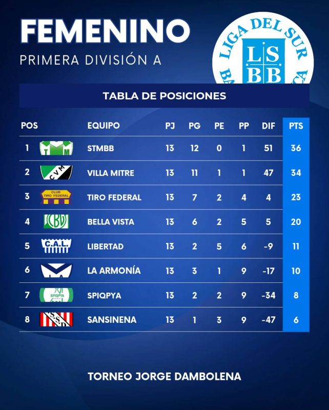 La Liga del Sur oficializó las tablas de posiciones finalizada la fecha 13 del Torneo Único de Primera A y Primera B del fútbol femenino.