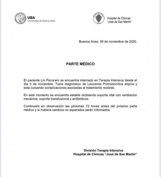 “El paciente Lío Pecoraro se encuentra internado en Terapia Intensiva desde el día 3 de noviembre. Tiene diagnóstico de Leucemia Promielocítica atípica y está cursando complicaciones asociadas al tratamiento recibido”, indica el escrito.