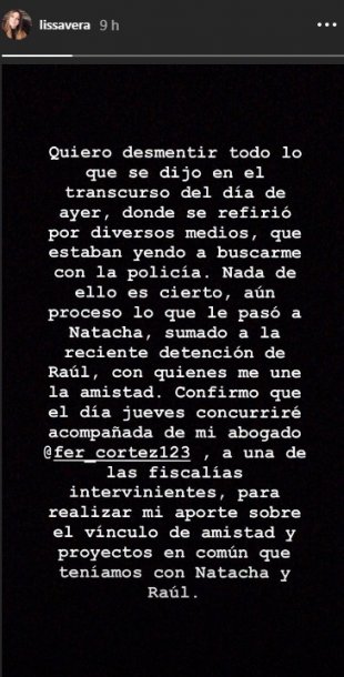 Luego de las declaraciones de Ulises Jaitt, hermano de Natacha, solicitando su urgente declaración, Vera hizo su descargo a través de las redes sociales: “Quiero desmentir todo lo que se dijo en el transcurso del día de ayer, donde se refirió por diversos medios que estaban yendo a buscarme con la policía. Nada de eso es cierto”.