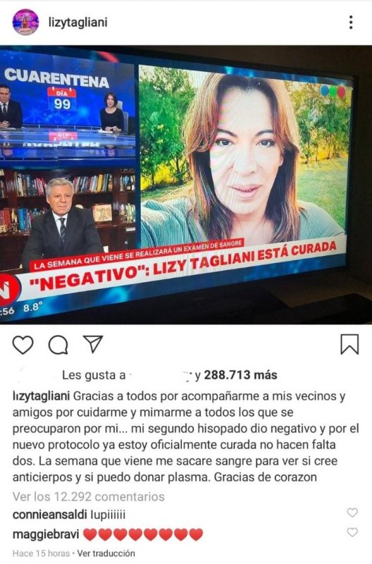 El caso de Lizy fue de lo que se catalogan como “asintomáticos”, esto quiere decir que no tuvo ningún tipo de consecuencia física a lo largo de la evolución del cuadro. En diálogo con “Telefé Noticias”, la presentadora expresó: “Estoy muy emocionada porque recién me acaba de llamar la doctora para decirme que el segundo test dio negativo. Así que estoy sola festejando con mis perros. Es una alegría muy grande, y ahora me dijo la doctora que voy a hacerme un análisis de sangre para ver si generé los anticuerpos. Estoy contenta“.