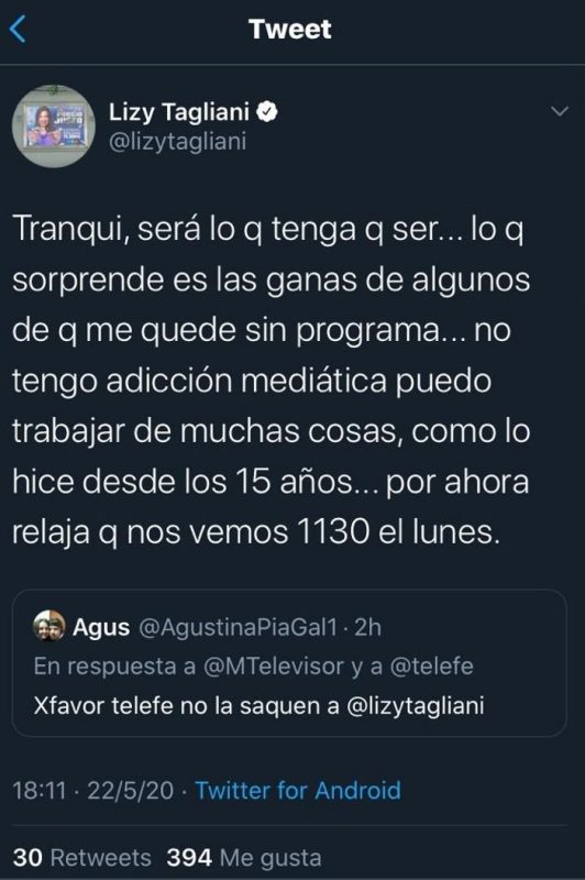 Al ser consultada en Twitter por esta información, la animadora y actriz respondió: “Tranqui, será lo q tenga q ser… lo q sorprende es las ganas de algunos de q me quede sin programa… no tengo adicción mediática puedo trabajar de muchas cosas, como lo hice desde los 15 años… por ahora relaja q nos vemos 1130 el lunes“.