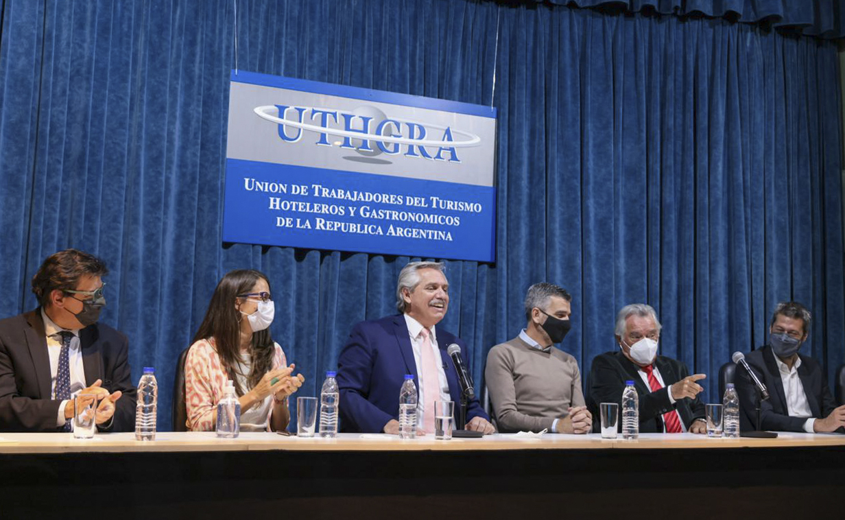 El acto se llevó a cabo en la sede de la Unión de Trabajadores Hoteleros y Gastronómicos de la República Argentina (Uthgra), en Avenida de Mayo 930, y participaron el jefe de ese gremio, Luis Barrionuevo, y los ministros Claudio Moroni (Trabajo), Elizabeth Gómez Alcorta (Mujeres, Género y Diversidades), Juan Zabaleta (Desarrollo Social) y Matías Lammens (Turismo y Deportes), entre otros funcionarios.