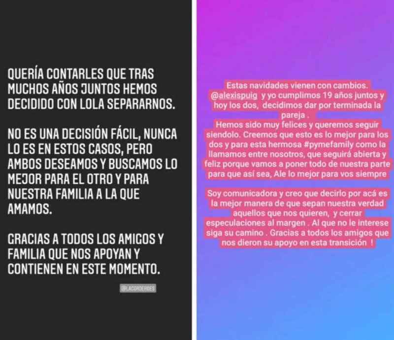 Por su parte, Lola también se refirió al hecho. No solo replicó la historia de su ex, sino que agregó: “Estas navidades vienen con cambios. Alexis Puig y yo cumplimos 19 años juntos y hoy los dos, decidimos dar por terminada la pareja”