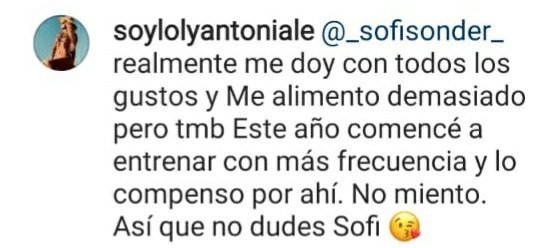 “Realmente me doy todos los gustos y me alimento demasiado. Pero también este año comencé a entrar con más frecuencia y lo compenso por ahí. No miento! Así que no dudes, Sofi”, respondió convencida Loly Antoniale, quien a pesar de tener una vida de ensueño en Miami, más de una vez ha amagado con volver a la Argentina para retomar una carrera que parecía no tener techo en sus primeros años. (Paparazzi)