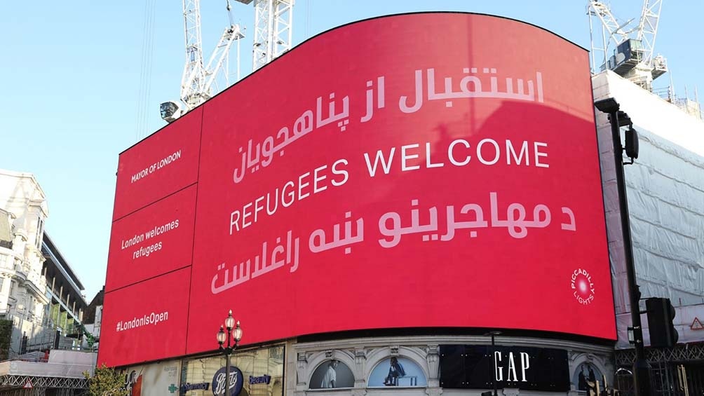 Uno de los mensajes de “Bienvenida a los refugiados” en inglés, en darí y pastún se muestra en las emblemáticas pantallas gigantes de Piccadilly Circus en el centro de Londres y en toda la red del transporte de la ciudad, un mensaje que no pasa desapercibido tras años de Gobiernos británicos con políticas abiertamente anti-inmigrantes, especialmente tras la victoria en las urnas del Brexit.