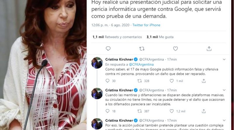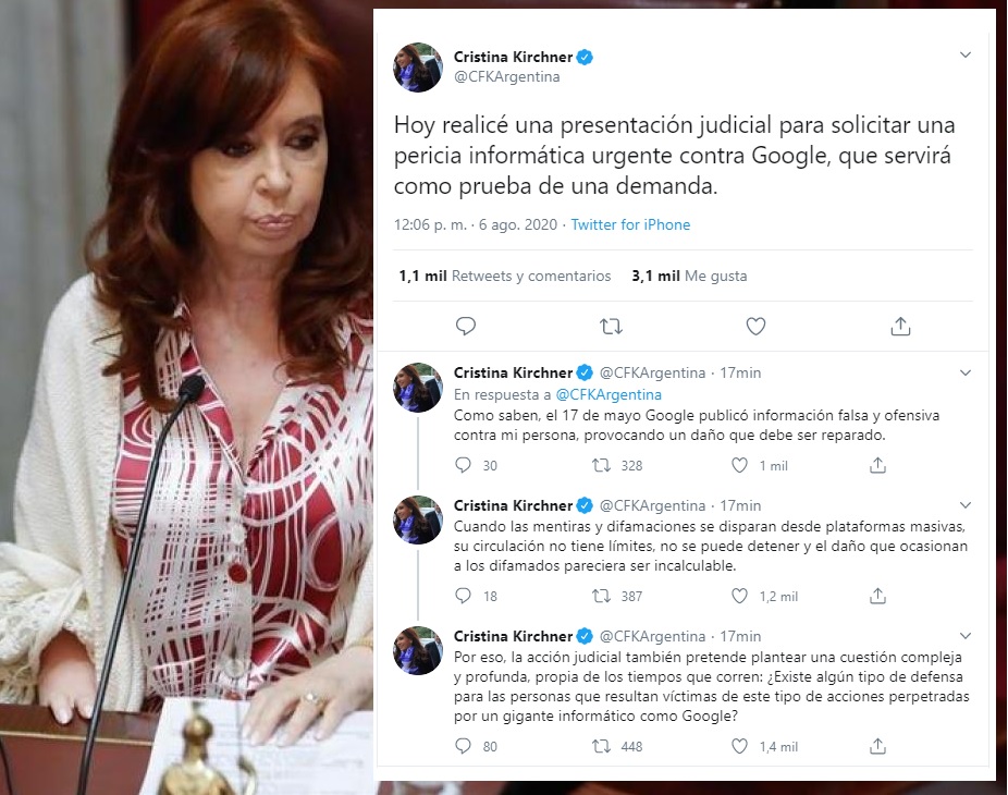 En su solicitud se considera que Cristina Fernández “ha sufrido estos ataques y mentiras por parte de opositores malintencionados, pero nunca habían sido perpetrados directamente por el buscador de internet, en uso de su propia plataforma, bajo su exclusiva responsabilidad y campo de acción”.