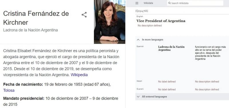 A mediados de mayo, el lateral derecho del buscador de Google mostraba el nombre de Cristina Fernández de Kirchner junto con una breve descripción que hacía referencia a ella como “Ladrona de la Nación Argentina”. Los abogados de la vicepresidenta realizaron una presentación judicial considerando que con dicha acción se estaba “mancillando su nombre, imagen y honor”.
