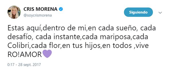 Al cumplirse un nuevo aniversario de su partida, su mamá le escribió unas emotivas palabras en su cuenta de Twitter: “Estas aquí, dentro de mí, en cada sueño, cada desafío, cada instante, cada mariposa, cada colibrí, cada flor, en tus hijos, en todos ,¡vive RO! AMOR.