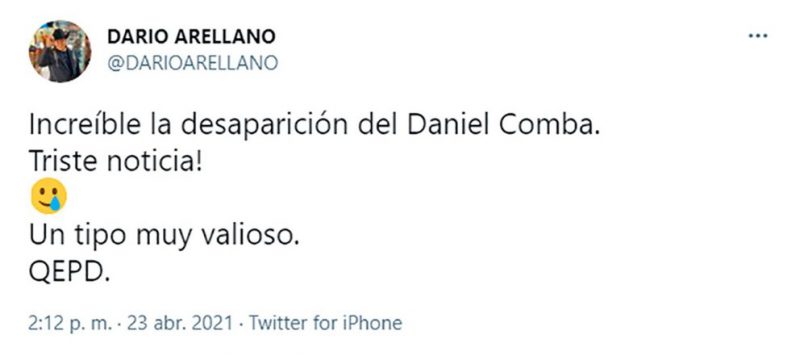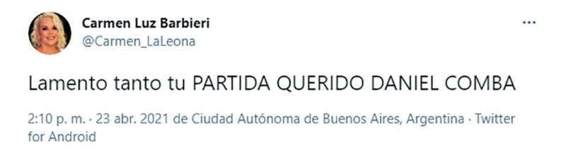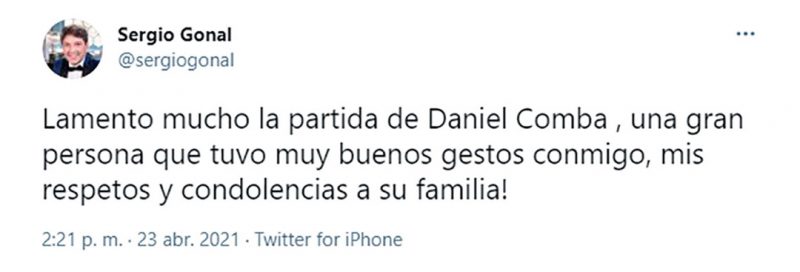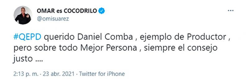 La humorista Gladys Florimonte se despidió del productor con mucho cariño: “Comba querido…. no lo puedo creer…. qué tristeza…. ¡tantos veranos compartidos! Abrazo a la familia”. El actor Sergio Gonal manifestó: “Lamento mucho la partida de Daniel Comba , una gran persona que tuvo muy buenos gestos conmigo, mis respetos y condolencias a su familia”. Mientras que Omar Suárez escribió: “#QEPD querido Daniel Comba , ejemplo de Productor , pero sobre todo Mejor Persona , siempre el consejo justo….”. Y Darío Arellano aseguró: “Increíble la desaparición del Daniel Comba. ¡Triste noticia! Un tipo muy valioso. QEPD”.