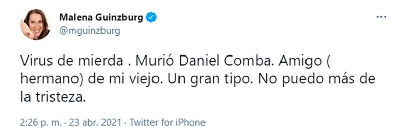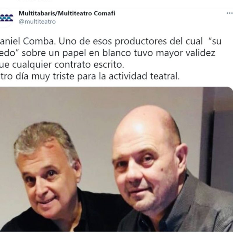 El empresario teatral Carlos Rottemberg también estaba conmovido por la triste noticia: “Daniel Comba. Consternados despedimos al colega y amigo”. Más tarde publicó una foto junto a él y escribió: “Daniel Comba. Uno de esos productores del cual ‘su dedo’ sobre un papel en blanco tuvo mayor validez que cualquier contrato escrito. Otro día muy triste para la actividad teatral”.