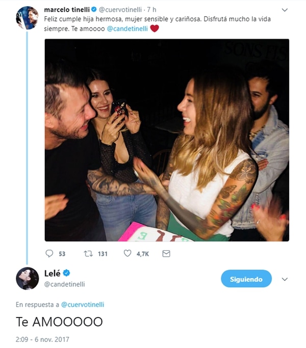 “Feliz cumple hija hermosa, mujer sensible y cariñosa. Disfrutá mucho la vida siempre. Te amo”, le escribió en Twitter Marcelo Tinelli a su hija Candelaria. Además, compartió una imagen de la celebración del cumpleaños número 27 de la diseñadora.