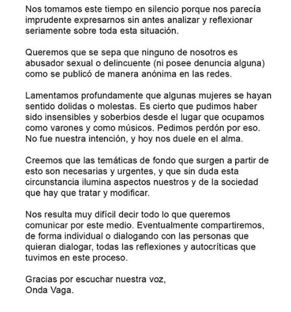 “Queremos que se sepa que ninguno de nosotros es abusador sexual o delincuente (ni posee denuncia alguna), como se publicó de manera anónima en las redes”, comienza el descargo, firmado con el nombre de la banda.