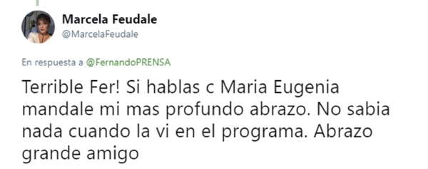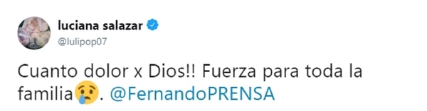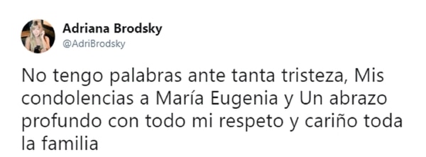 Luciana Salazar, Jésica Cirio, Marisa Brel, Marcela Feudale, Sofía Macaggi, Adriana Brodsky, Alejandro Lerner, Claudio Rígoli, y Lío Pecoraro, entre otros famosos, se expresaron a través de Twitter, red social en la que le enviaron sus condolencias a la conductora de Mañanas nuestras, por la pantalla de KZO.