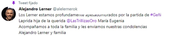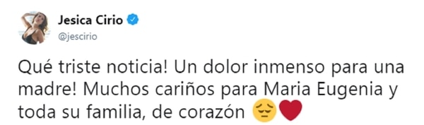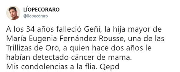 Muchos famosos le enviaron mensajes de apoyo a través de las redes sociales a María Eugenia Fernández Rousse tras la muerte de su hija Geñi, que falleció este lunes después de luchar durante casi tres años contra un cáncer de mama.