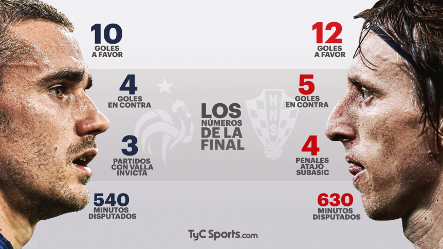 – Francia disputó 540 minutos (6 partidos), mientras que Croacia batalló durante 630′ (6 encuentros, 3 alargues y 2 definiciones por penales).