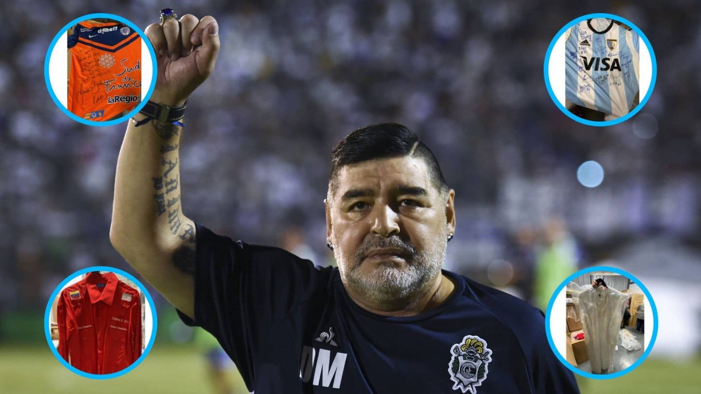 Y también hay prendas de vestir de Maradona que utilizó, como trajes con los que concurrió a entregas de premios. El pijama con el que celebró su cumpleaños en 2016, un saco con su silueta en la espalda y el “10”, entre otras prendas.