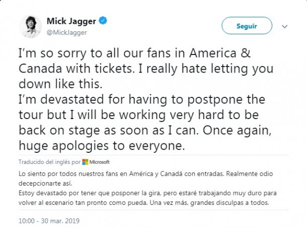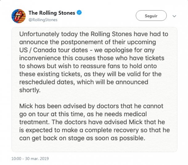 “Mick ha sido advertido por los médicos que no puede salir de gira en este momento, ya que necesita tratamiento médico”, informa el comunicado publicado en el Twitter de la banda esta mañana, seguido de otro mensaje escrito por el propio Jagger.