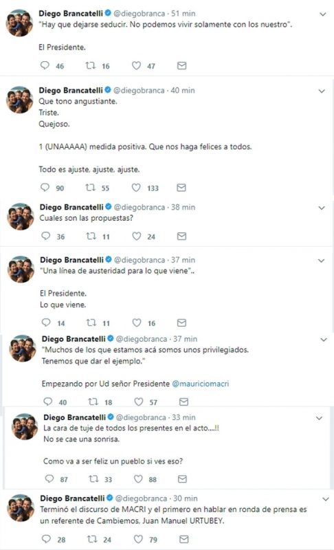 “Qué tono angustiante. Triste. Quejoso. Una medida positiva. Que nos haga felices a todos. Todo es ajuste, ajuste, ajuste”, escribió Diego Brancatelli en su cuenta de Twitter mientras el presidente Mauricio Macri presentaba una agenda de reformas ante referentes de los tres poderes del Estado, en el Centro Cultural Kirchner (CCK).