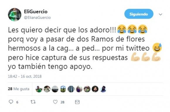 “¡¡¡Les quiero decir que los adoro!!! Porque voy a pasar de dos ramos de flores hermosos a la cagada… a ped… por mi twitteo Pero hice captura de sus respuestas, yo también tengo apoyo”, agregó minutos después, reconociendo que sus mensajes podrían provocar algún cortocircuito en casa.