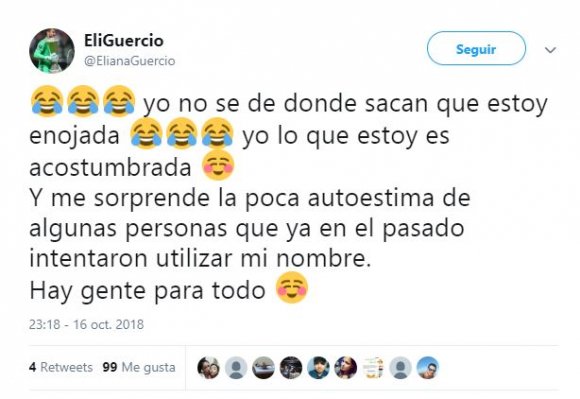 Unas horas más tarde, Guercio volvió a usar la red social “Yo no sé de dónde sacan que estoy enojada. Yo lo que estoy es acostumbrada. Y me sorprende la poca autoestima de algunas personas que ya en el pasado intentaron utilizar mi nombre. Hay gente para todo”, completó.