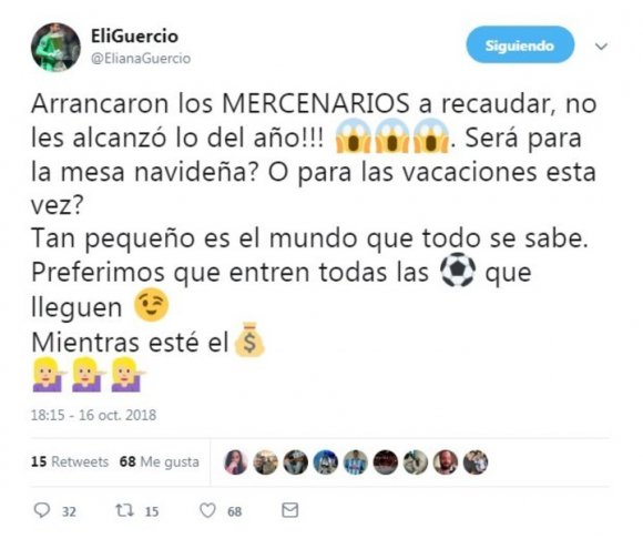 “¡Arrancaron los MERCENARIOS a recaudar, no les alcanzó lo del año! ¿Será para la mesa navideña? ¿O para las vacaciones esta vez? Tan pequeño es el mundo que todo se sabe. Preferimos que entren todas las pelotas que lleguen mientras esté el dinero”, comenzó, indignada la rubia.