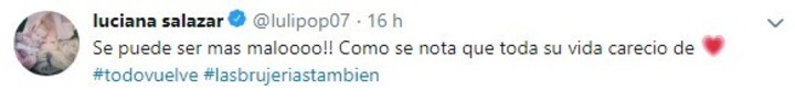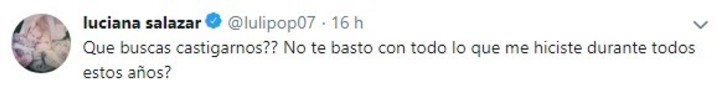 Además, Salazar agregó en otro tweet: “¿Qué buscás? ¿Castigarnos? ¿No te bastó con todo lo que me hiciste durante todos estos años?”.