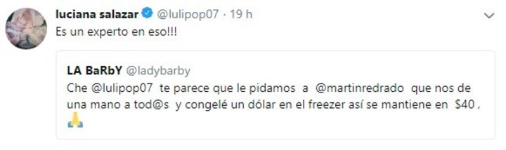 “Che, @lulipop07, ¿te parece que le pidamos a @martinredrado que nos dé una mano a tod@s y congelé un dólar en el freezer así se mantiene en $40?”, tuiteó la humorista La Barby. Y Luciana le contestó: “¡¡¡Es un experto en eso!!!”.