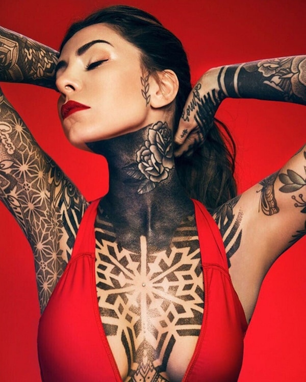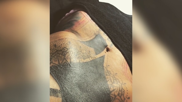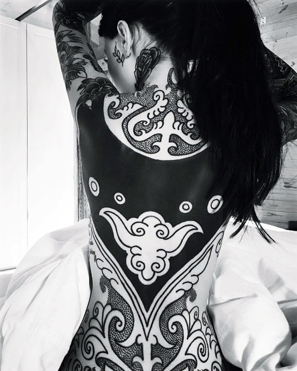 La joven se está realizando una técnica conocida como “blackout” que consiste en cubrir con tinta negra grandes superficies para tapar diseños viejos. Es una tendencia que se impuso entre quienes se arrepienten de tattoos anteriores.