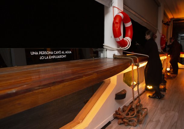 Valijas, sillas, y una luz tenue amarilla ambientaban el lugar. “Una persona cayó al agua, ¿o la empujaron?”, se podía leer en uno de los laterales.