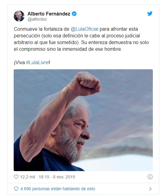 “Conmueve la fortaleza de @LulaOficial para afrontar esta persecución (solo esa definición le cabe al proceso judicial arbitrario al que fue sometido). Su entereza demuestra no solo el compromiso sino la inmensidad de ese hombre”, tuiteó Fernández.