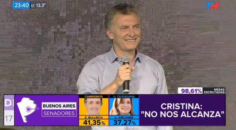 El presidente Mauricio Macri sostuvo esta noche que “hoy confirmamos nuestro compromiso con el cambio” tras un “día inolvidable para nuestro querido país” y dijo que “aspiramos a más”, en su discurso desde el búnker de Cambiemos en Costa Salguero.