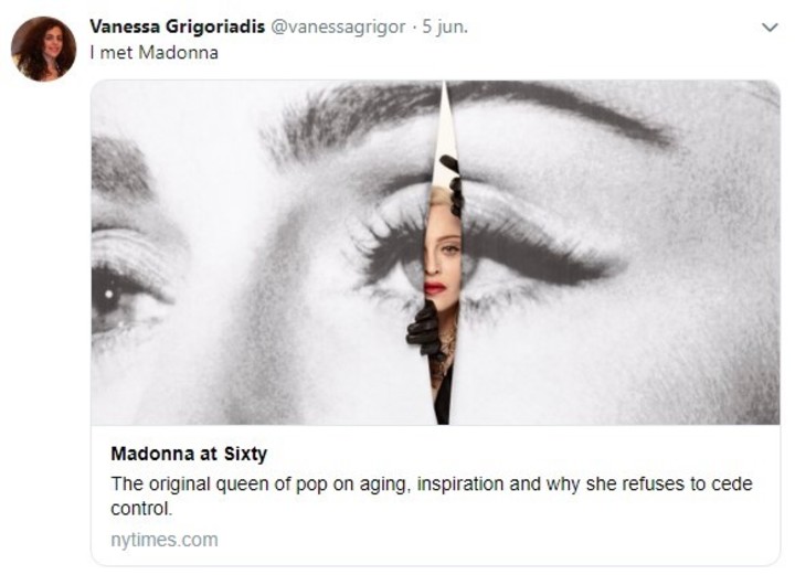 Por su parte, la periodista en cuestión compartió el pasado 5 de junio la nota que le hizo a Madonna en su cuenta de Twitter. Orgullosa de su trabajo, Grigoriadis acompañó ese tuit junto a la siguiente frase: “I met Madonna“, que en español quiere decir “conocí a Madonna“. (Clarín)