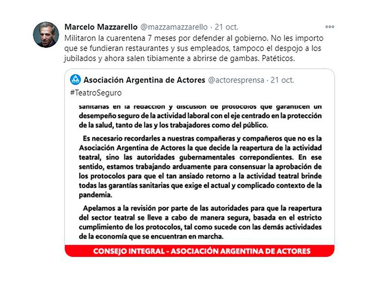 Durante la charla con Ángel De Brito, Mazzarello explicó por qué criticó al sindicato de Actores: “La posición institucional del gremio es estar al lado del Gobierno, sosteniendo la cuarentena a cualquier precio. Ese fue la posición y ese fue el motivo del tuit. Salieron ahora con más o menos todo jugado y sumándose un poco a que los empresarios pidieron, en particular (Carlos) Rottemberg que dijo: ‘¿Cómo que no va a haber temporada?’. El gremio se subió a ese cambio”.