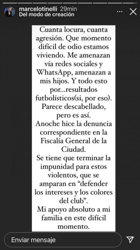 La situación obviamente tomó estado público y por eso, él mismo decidió explicar la situación en sus redes sociales. “Me amenazan vía redes sociales y Whatsapp, amenazan a mis hijos y todo por… resultados futbolísticos. Sí. Por eso. Parece descabellado pero es así“.