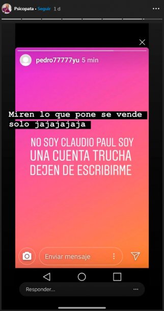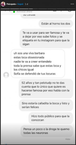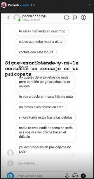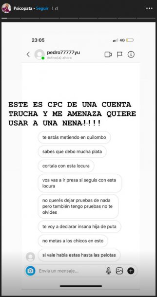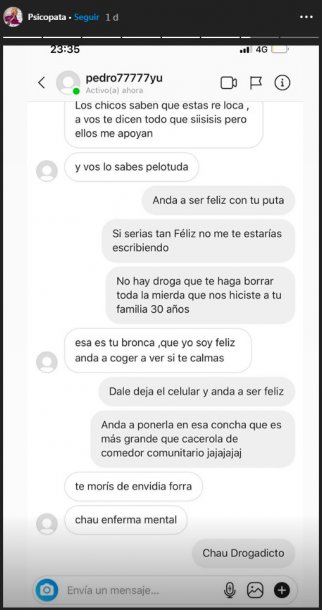 Y continúa: “Nadie te cree, nadie te toma en serio, ni a vos ni a los chicos que hacen el ridículo. Yo vivo tranquilo, dejame de joder”. Mientras ella le retrucaba que estaba “al horno” si llegaba a publicar información, el usuario “Pedro77777yu” le responde con agresiones: “Enferma de mierda”.